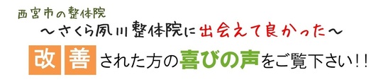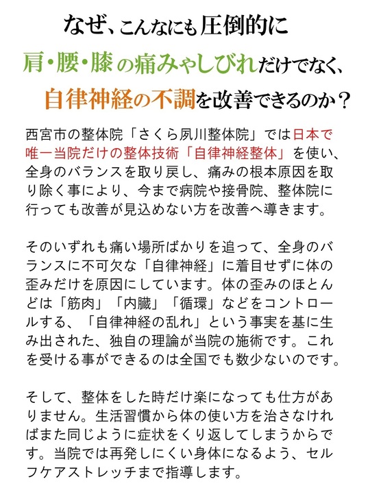 尼崎市天崎クリニックの院長先生にさくら夙川接骨院を紹介していただきました。院長先生の神の手とスタッフみなさんの優しさが決め手となりました。