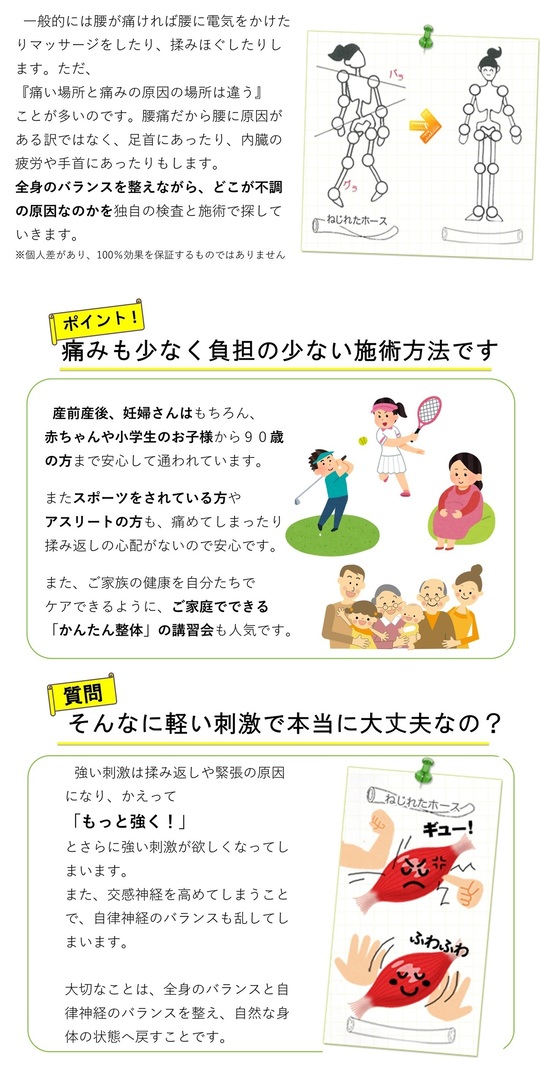 腰痛、関節痛のみならず、身体の痛みを感じる方々へ是非お勧め致します。