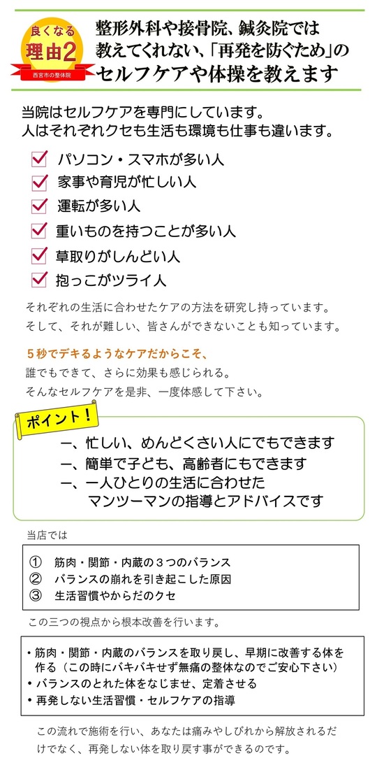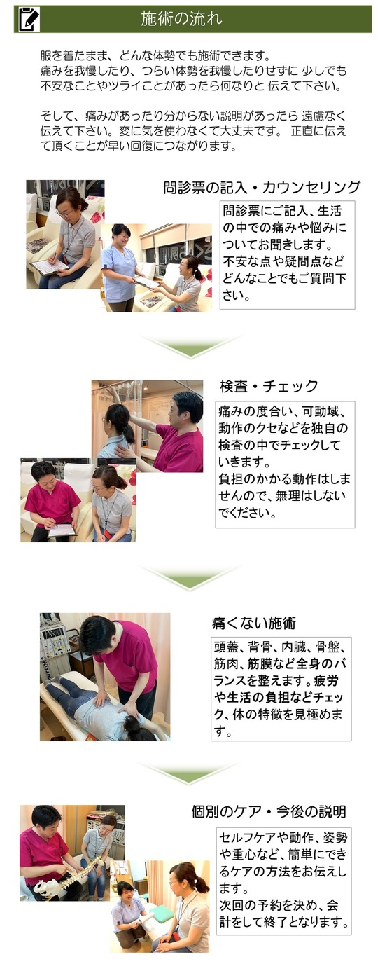 ただ痛みをとるだけでない、体や自分にとって大切なことも沢山教えてくださるところだと思います。今まで知らずに生活していたので、これから自分のために体に良いことをしていこうと思わせてくれるクリニックです。